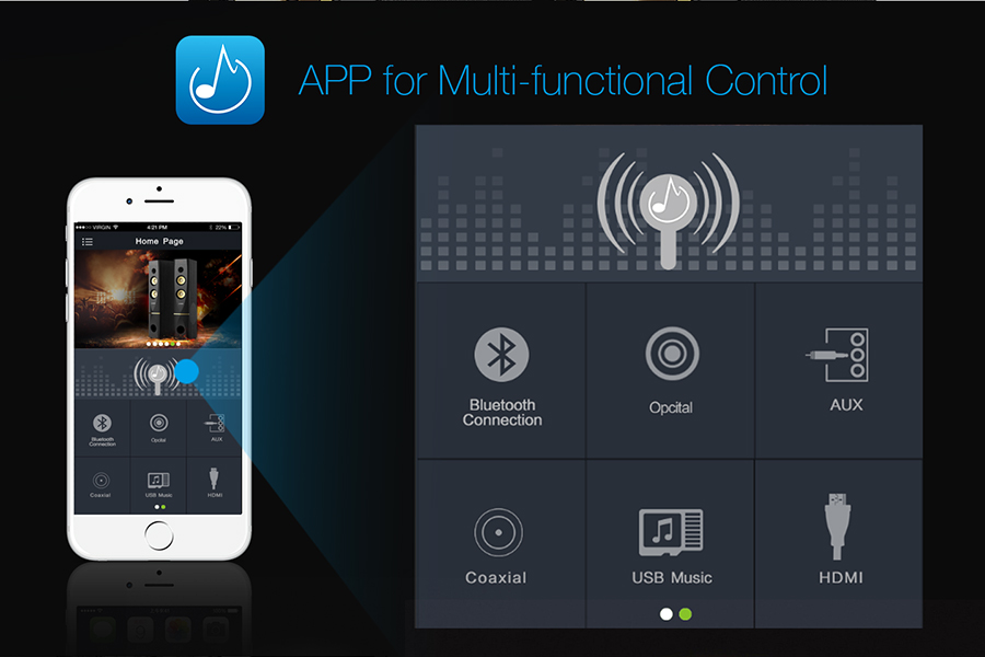- Supports HDMI ARC,Optical drive, AUX, audio input, Bluetooth and USB